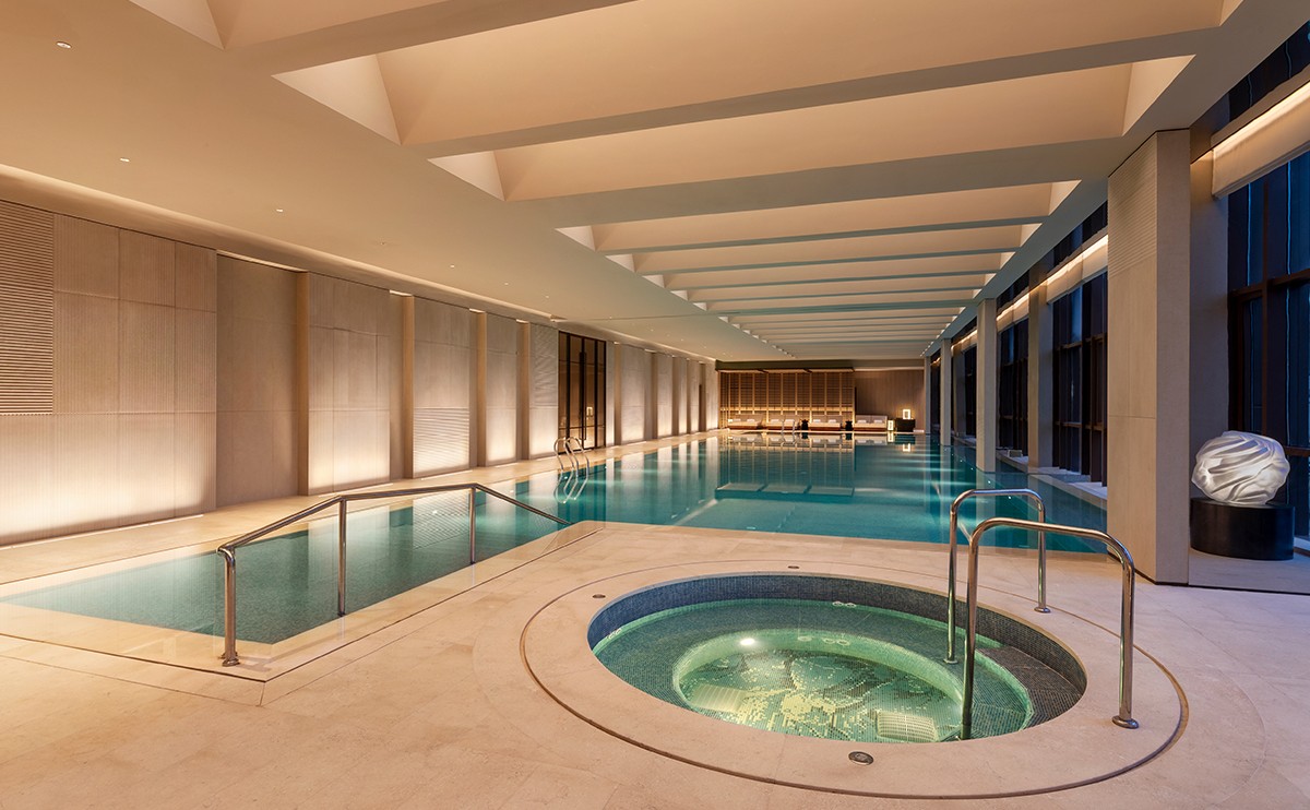 酒店恒温泳池以无边际设计延伸至南湖绿意,盐艺景石点缀的“盐府景园”在仿自然天光下营造轻松氛围